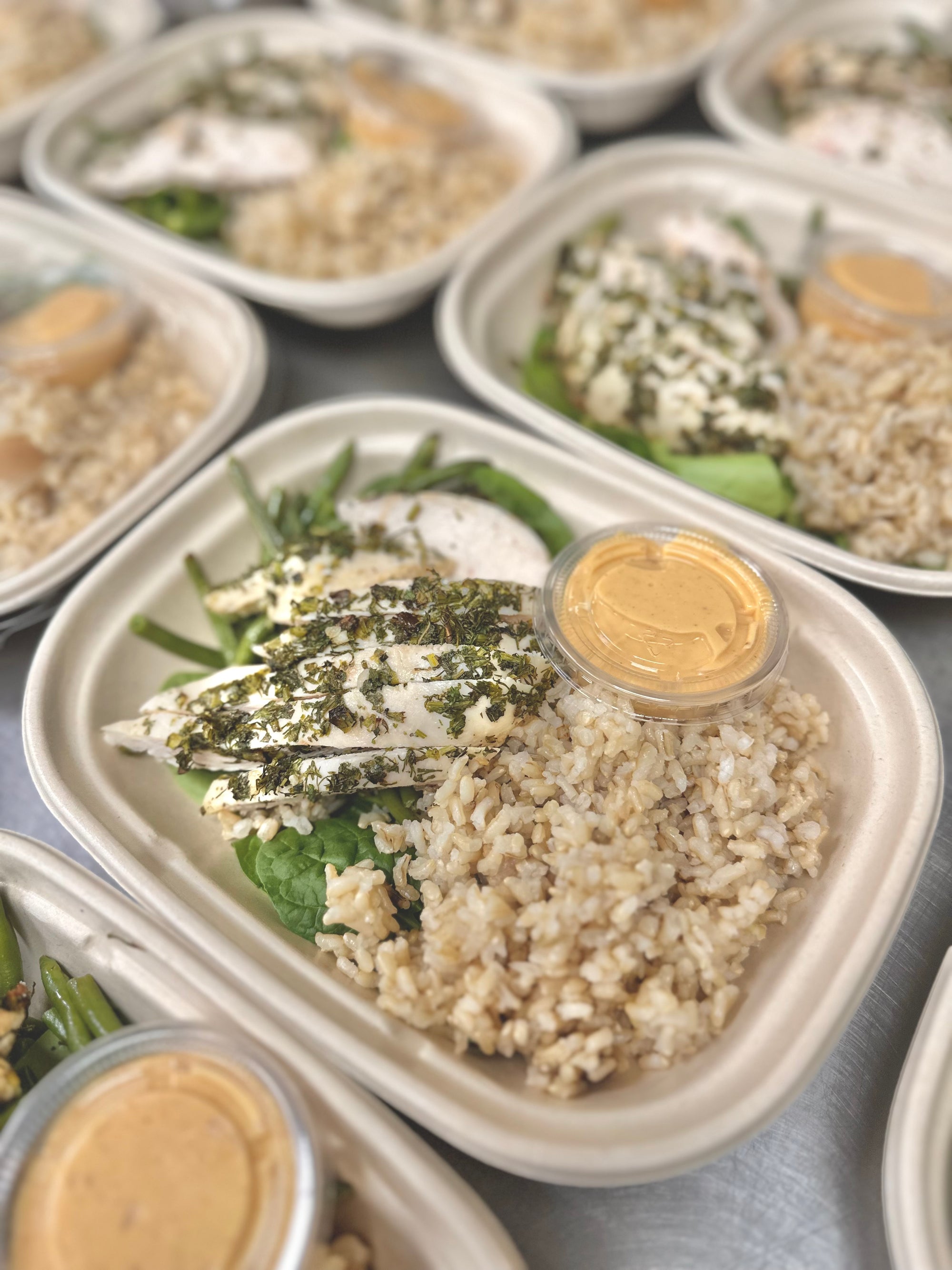 Local chicken | Roasted Green Beans | Organic brown rice | Organic onion | Dijon | Sprout BBQ sauce | Garlic | Dill | Mint | Honey | Lemon