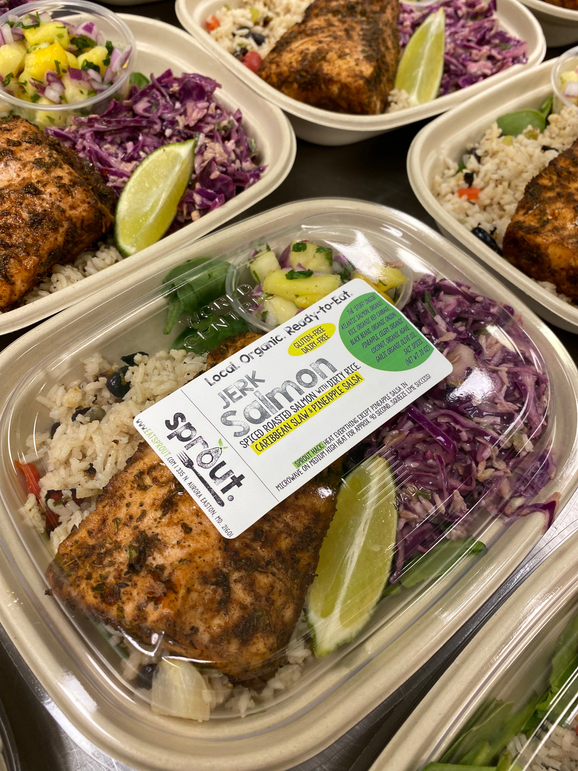 Farm caught salmon | Pineapple | Organic red cabbage | Organic rice | Black beans | Organic red pepper | Organic onion | Celery | Organic coconut | Lime | Cilantro | Agave | Garlic | Spices | Mayo | Cinnamon